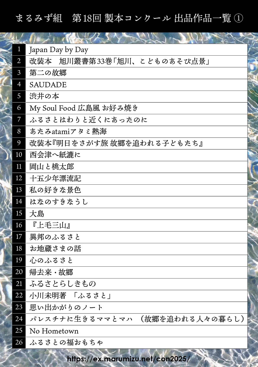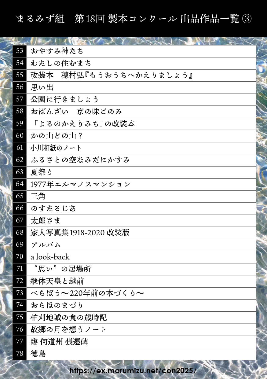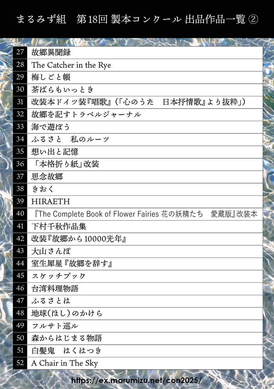 ようこそ手製本工房まるみず組の製本コンクールへ!この企画は組員と一般参加の方合わせて100以上、テーマに沿って手製本の技術を使って作品を作り、発表するものです。今年も沢山の素敵な作品を見ることが出来ます。会場、ウェブ上どちらでもお楽しみください。