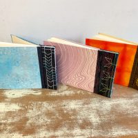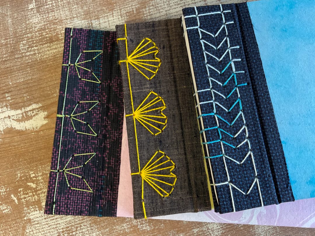 故郷の風景を3冊の和綴じノートで表現しました。表紙の色とかがりの形で季節を感じていただけたら嬉しいです。