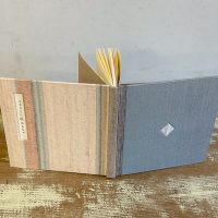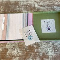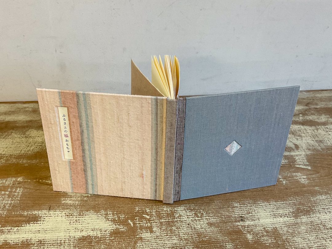 ご自身で染めた糸で織った布の表紙と夫婦箱、版画や文章も手づくりで、素晴らしいです。色あいも福おもちゃのイメージでやわらかくあたたかいです。