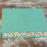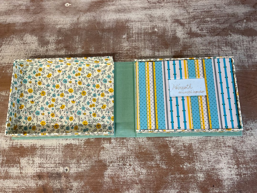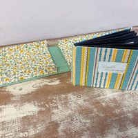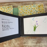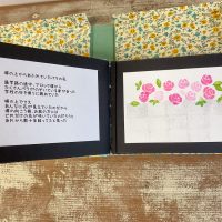 黒ケント紙を使用。(版画部分はアラベール130kg)自作の消しゴムハンコに短文をつけてアルバム風に仕立てました。