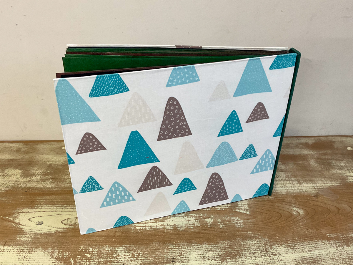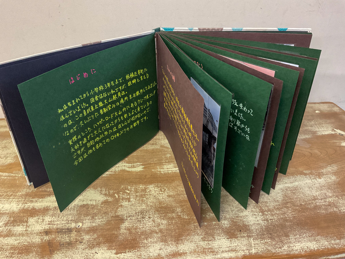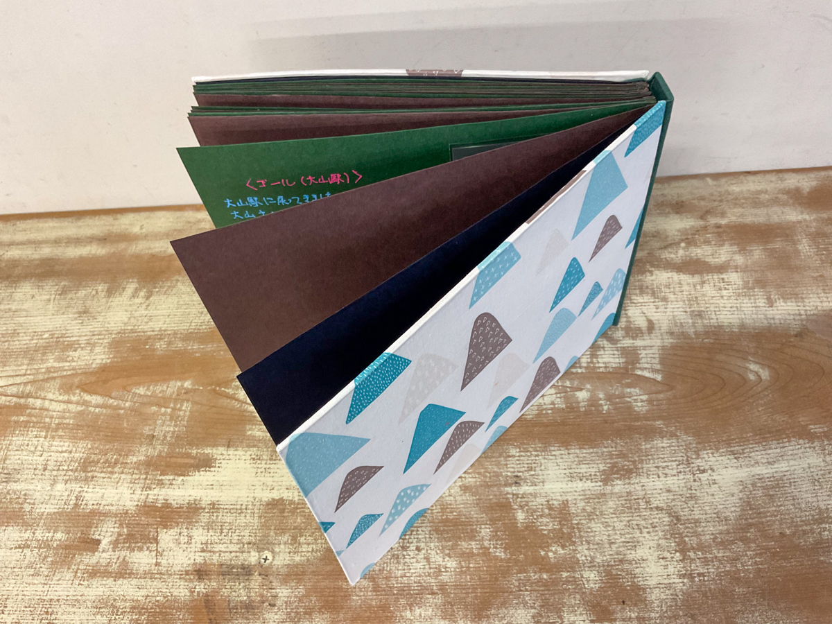「大山」の地名の由来から、山をイメージした色合いの本文紙を選び、表紙布も山にしてみました。