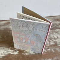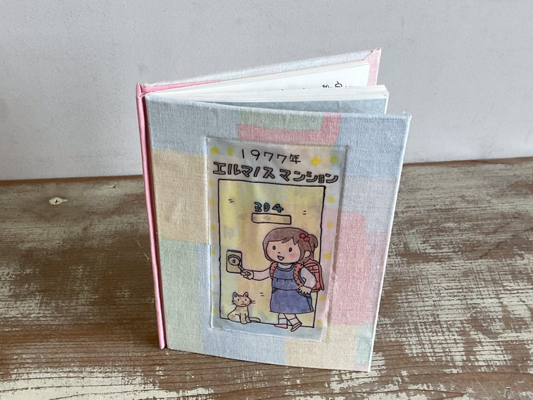 ポップコーン和紙に、ペンと色鉛筆でイラストを描き、透ける布で裏打ちして表紙にしました。ドイツ装です。