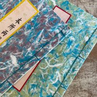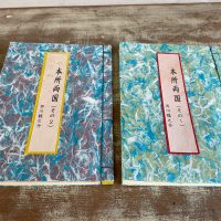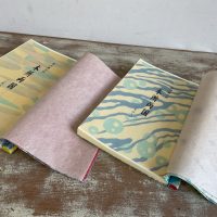素材は糸入り染紙や大礼紙、インクジェット対応の簀の目入など、手持ちの和紙を組み合わせて使い、四つ目綴じの和本に仕立てました。