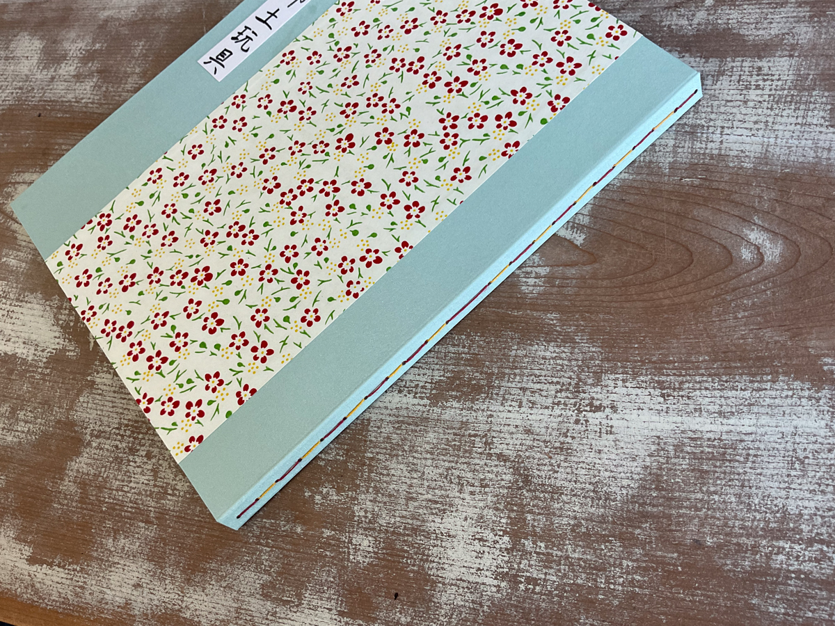 一折り中綴じの本だったため、応用のシングルステッチで綴じました。本の表紙が青緑だったため、薄緑のクロスや見返しも青系を使用しました。