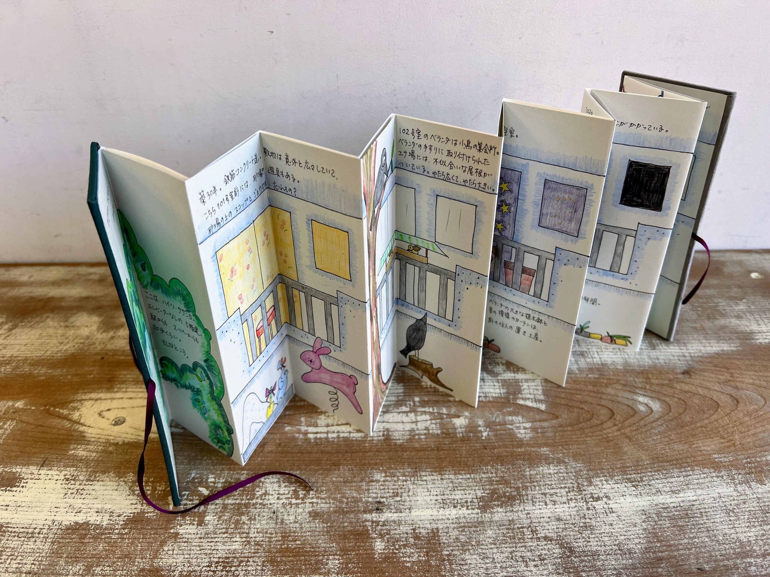 た。また、本として読むだけでなく、広げたり、放射状に丸めて飾ることもできるようにと考えて作成しました。表紙と裏表紙は、集合住宅の外観のイメージです。ゴ