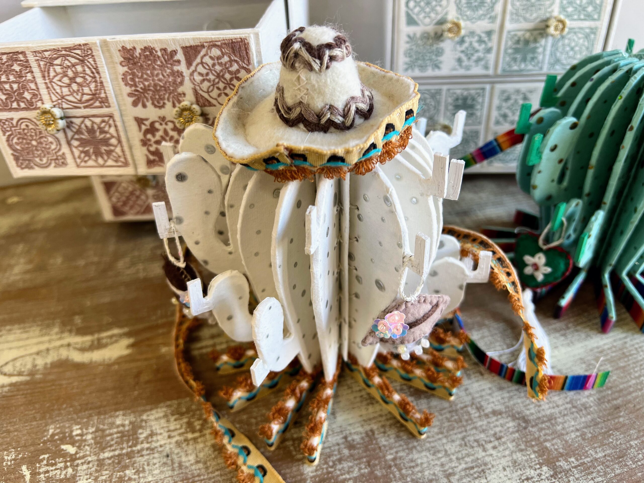[作品説明] サボテンを模したツリー1点とメキシコのアニマリート風オーナメント16点をチェストに入れたセットです。憧れの国メキシコの可愛さを詰め込んでみました。陽気なクリスマスツリーとしても、また季節を問わずに飾って頂くことの出来るツリーです。オーナメントではなく、アクセサリーを吊るしてアクセサリースタンドとしてもご利用頂けます。